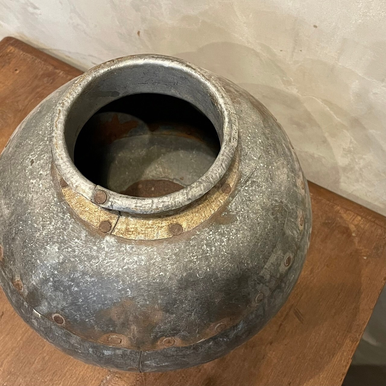 インドから仕入れた、ブリキ製の壺(小)です。